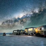 Descanso en un albergue rústico adaptado para viajeros, rodeado de un cielo estrellado impresionante.