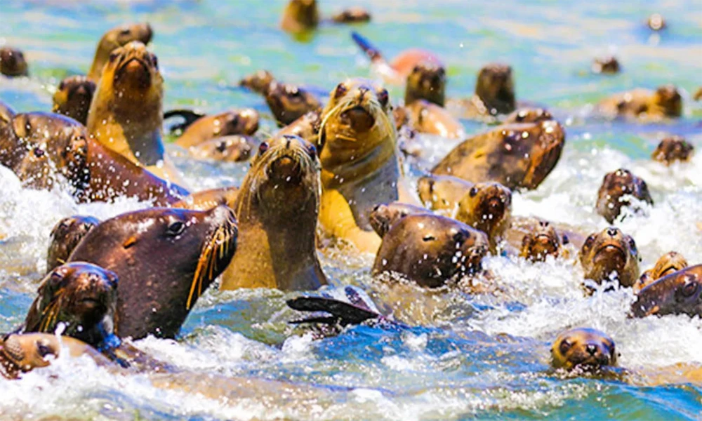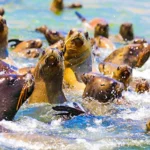 - Lobos marinos descansando sobre las rocas y nadando cerca de la embarcación.