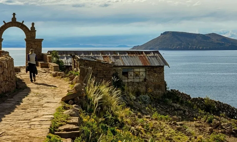 Al desembarcar, inicia una caminata por senderos de piedra que ascienden suavemente hacia el poblado principal. En el recorrido se observan terrazas agrícolas de papa, quinua y habas, además de ovejas y llamas pastando.